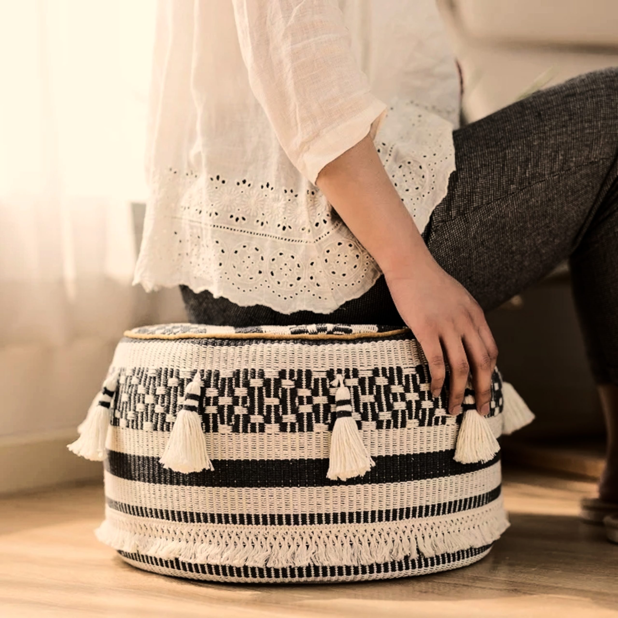 Includes side handle for ease of carry. The outer fabric of the ottoman comprises of various layers of intricate designs and includes tassels and frills.